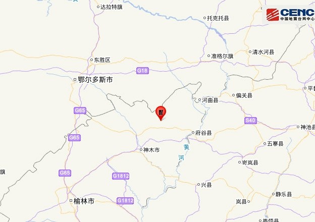 震中位于榆林市府谷县境内。中国地震台网中心官方微博截图