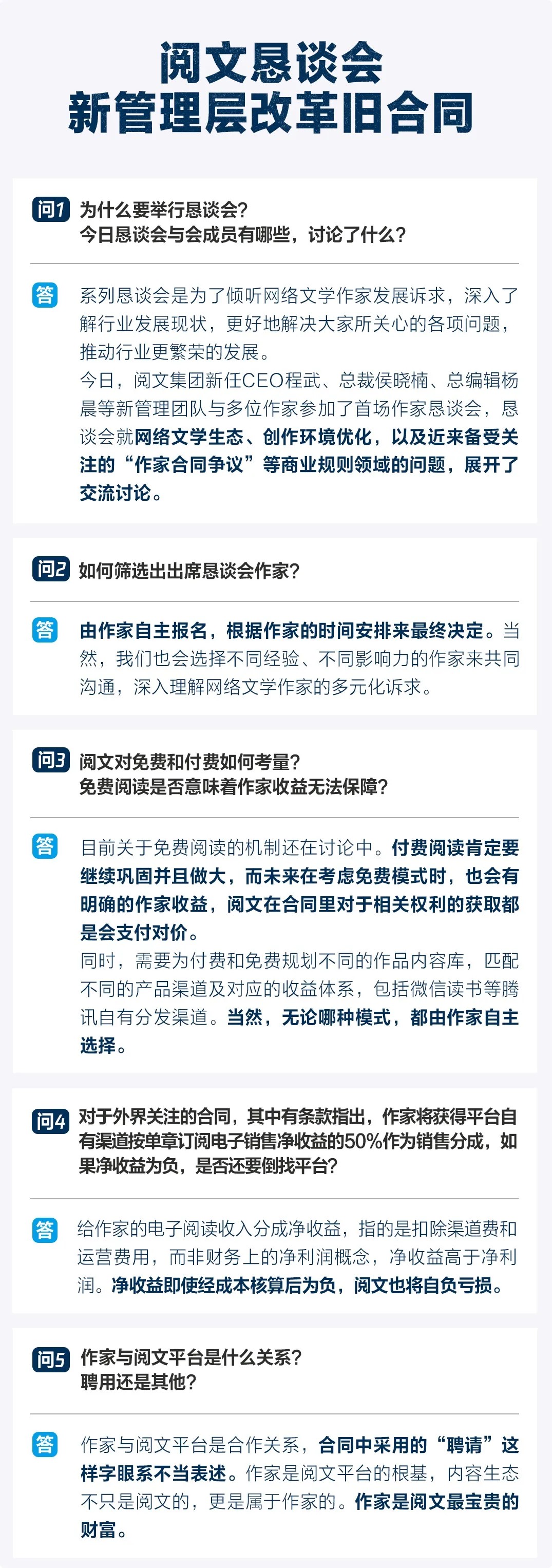 但这并未结束,随着事件的升级,“五五断更节“风波愈演愈烈,这背后除了多年的行业沉疴外,也不乏某些力量的可以煽动和造谣、推动。新管理团队面对这些旧问题,并没有选择回避问责任,而是及时沟通,及时发声,并在第一时间举办了作家恳谈会。在5月6日的阅文和作家恳谈会上,阅文新任CEO程武及其新管理团队解答了诸多疑惑,打消了作家的不安,释放改革方案思路。水哥也总结了恳谈会的一些关键信息:1. 程武和侯晓楠认为,作家是阅文平台的根基。内容生态不只是阅文的,更是属于作家的。2. 2019年启用的合同是多年来的历史遗留问题,也是一个商业规则的问题,不合理之处应该也必须修改;3.对于包括改编版权等各种衍生权利在内的著作财产权,将会在双方自愿的前提下,为作者的授权匹配对应的权益。会考虑提供多版本的合同选择,对授权权限分级,把选择权交给作家。