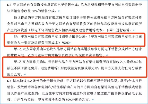 阅文16年版本的合同规定,“甲方网站自有渠道按单章订阅电子销售分成:乙方将获得相当于甲方网站自有渠道电子订阅销售净收益50%的销售分成。“并在详细的介绍中明确,当“所获直接收入扣除成本(包括不限于渠道费用、运营费用等)后收益为负数或零元时,甲方无需支付任何分成费用给乙方。”这一描述,19年的版合同上也保持了一致。