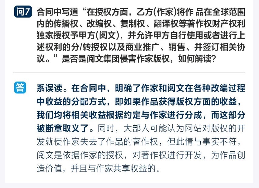 19年版合同中也就互动阅读体验、翻译作品、音频改编、同人作品等不同类型定义了相应的分成比例。当然每个模块的具体分成比例多少以及授权的选择权是否在作家手中还有待商榷。但不可否认的是,这些条款在的16年和19年的阅文合同版本均有提及,由此可以断定“新合同“不新。所以说,所谓的“腾讯资本入侵”、新管理层推出的“新合同“等都是多年积怨的宣泄口,阅文新管理团队成为了不折不扣的背锅侠。