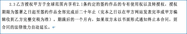 授权条款相关的还有很多,就不一一罗列了。各家条款的表述大同小异,但中心思想都一样:全版权、独家授权。授权时间上,有个别平台换了个很鬼的说法,20年加到期不通知自动续约。20年,到期不通知自动续约,感觉和其他家并无实质区别。