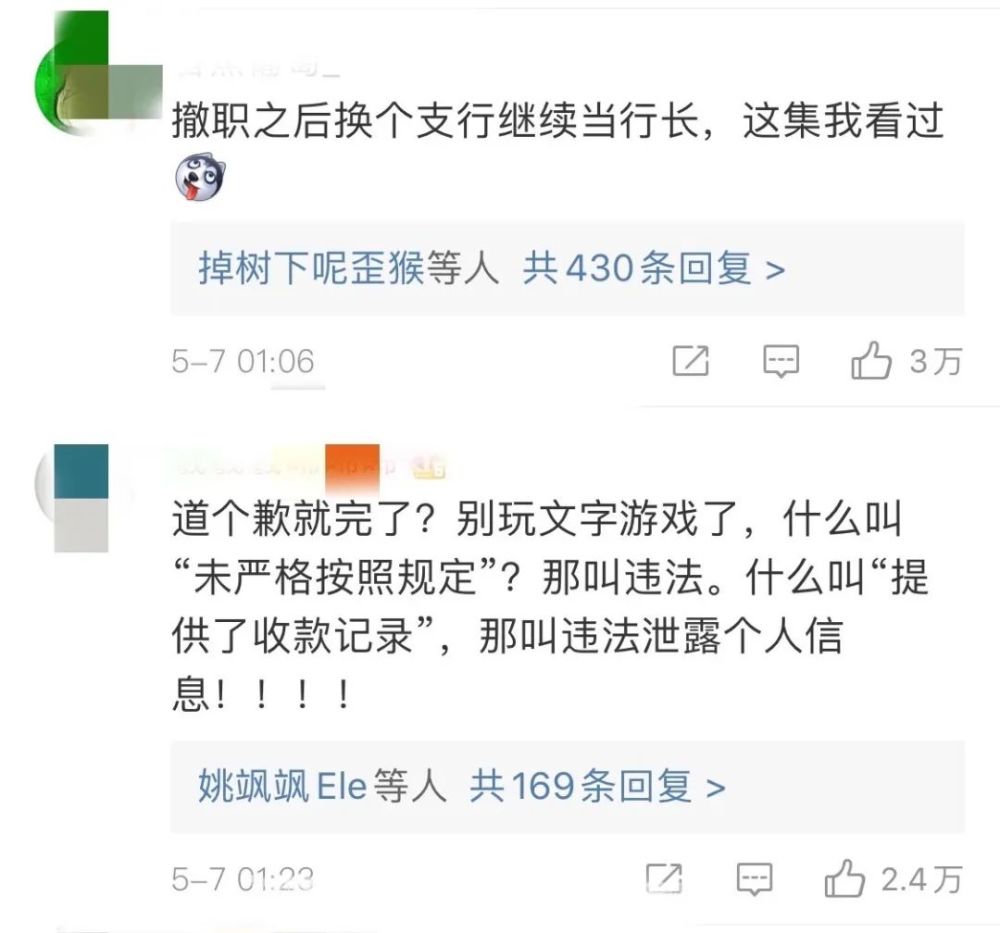 对于此事,网友立刻炸了,纷纷在中信银行官方微博上留言质疑,“银行大客户能查询个人账户的隐私吗?”“配合大客户啥都可以干?”“银行流水大客户就可调出?谁给你的权利?”