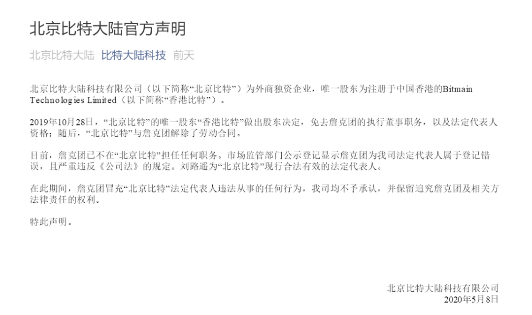 2019年10月,北京比特大陆法定代表人由詹克团变更为吴忌寒,吴忌寒重任CEO;