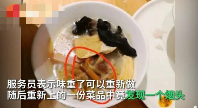 "服务员说味道重了的话,让厨师重新做。过了一会儿,重新上了一份烩菜,正吃着,却发现里面有个烟头,"郑先生说,他叫来服务员,对方解释可能是不小心掉进去的,可以退掉。