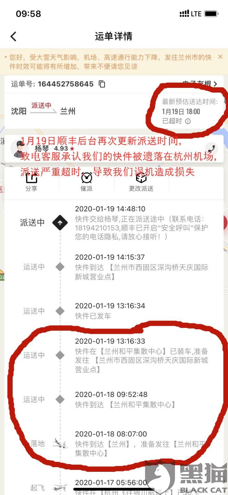 消费者“匿名”在5月8日向黑猫投诉平台反映:“我于飞猪平台给我父亲买购买了2020年1月18日19:55从兰州飞北京(票价3057人民币),1月19号03:40从北京飞莫斯科(票价510人民币)的机票。2020年1月15号俄罗斯签证办好后从沈阳寄出,走的顺丰速运,顺丰承诺1月17日18:00前能送达兰州收货地址(详情见附件),1月17日等到晚上也没收到快件,故致电顺丰客服,告知我们快件已从杭州发往兰州,承诺1月18日早上能送达,由于从兰州到北京的飞机是1月18日傍晚起飞,故答应再等一天。但1月18日中午需要出发去机场我们还没有收到快件,因此怕误机非常焦急,再次致电顺丰速运客服,得到回复我们快件已在兰州和平集散中心分发,如果着急可以直接去兰州和平集散中心取件。父亲提着两大大行李箱匆忙赶去快件集散中心,但找了一下午直到误了飞机也没有找到我们的快件,后致电客服得到的回复却是我们的快件被落在杭州萧山机场,并没有装上飞机,通完电话后在顺丰速运后台查询他们已把送达时间改到了1月18日18:00前,但直到1月19日傍晚顺丰快递员才把签证送到我们手里,父亲因此误了两段飞机,国内国际两张机票共计3567元的费用却需要我们承担损失。 根据《快递服务》国家标准,对标准快递服务时限的规定“同城快递服务时限不超过24小时,国内异地快递服务不超过72小时”,我们的快件签收时间超过服务时限,理应认定为快递延误。况且本次快递延误是由快递公司自身的漏发错发行为导致的,多次联系客服核实的情况都不一致,快递公司并没有及时并积极补救,造成快件送达时严重超时,收件人误机产生了经济损失,要求顺丰速运赔偿由于漏发快件导致送达严重超时给我们造成的经济损失(机票费用)共计3567元。”