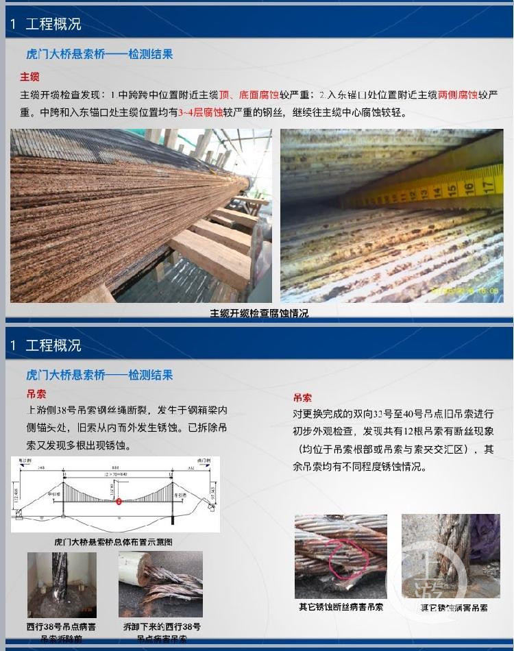 ▲网传“虎门大桥发生异常抖动的检测结果”,实际上是2019年11月《莞佛高速虎门大桥段大修改造工程方案设计汇报》。该文件显示,虎门大桥有吊索钢绳断裂,还有主缆开缆检查腐蚀较严重。图片来源/网页截屏