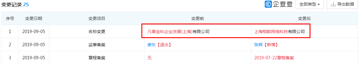 企查查显示,上海榕数原名为凡普金科企业发展(上海)有限公司(简称凡普金科)。2019年9月5日,凡普金科发生多项变更,其将名称变更为上海榕数网络科技有限公司。