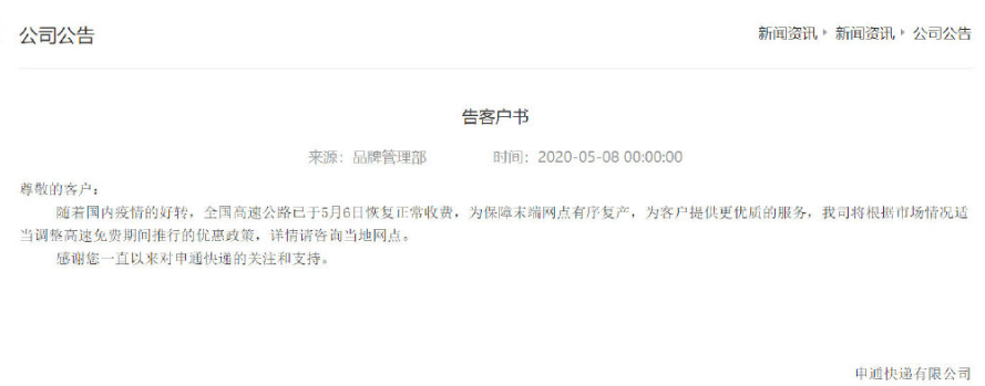 申通快递在《告客户书》中表示,“随着国内疫情的好转,全国高速公路已于5月6日恢复正常收费,为保障末端网点有序复产,为客户提供更优质的服务,我司将根据市场情况适当调整高速免费期间推行的优惠政策,详情请咨询当地网点。”