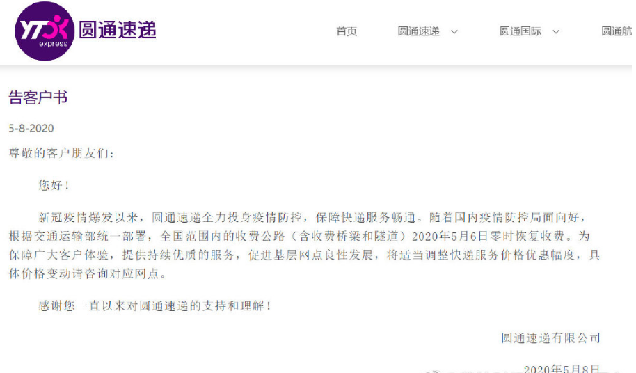 圆通快递在公告中称,新冠肺炎疫情暴发以来,圆通速递全力投身疫情防控,保障快递服务畅通。随着国内疫情防控局面向好,根据交通运输部统一部署,全国范围内的收费公路(含收费桥梁和隧道)2020年5月6日零时恢复收费。为保障广大客户体验,提供持续优质的服务,促进基层网点良性发展,将适当调整快递服务价格优惠幅度,具体价格变动请咨询对应网点。