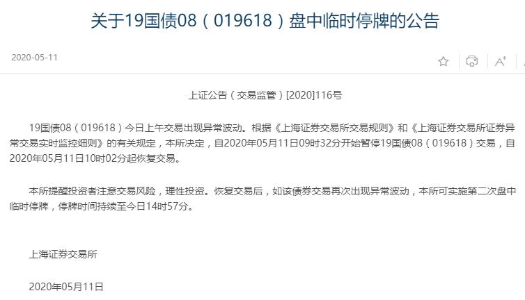 恢复交易后,如19国债08(019618)交易再次出现异常波动,本所可实施第二次盘中临时停牌,停牌时间持续至今日14时57分。