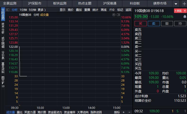 根据《上海证券交易所交易规则》和《上海证券交易所证券异常交易实时监控细则》的有关规定,本所决定,自2020年05月11日09时32分开始暂停19国债08(019618)交易,自2020年05月11日10时02分起恢复交易。停牌前,19国债08报价109.00元,下跌10.66%。