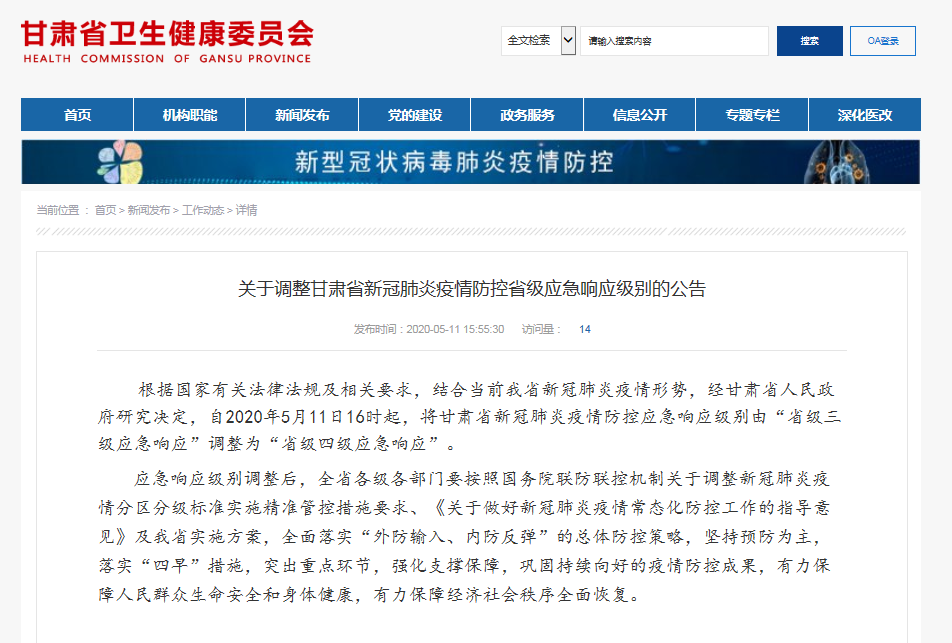 根据国家有关法律法规及相关要求,结合当前我省新冠肺炎疫情形势,经甘肃省人民政府研究决定,自2020年5月11日16时起,将甘肃省新冠肺炎疫情防控应急响应级别由“省级三级应急响应”调整为“省级四级应急响应”。