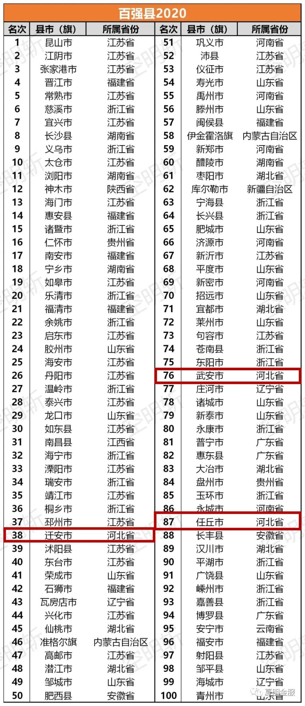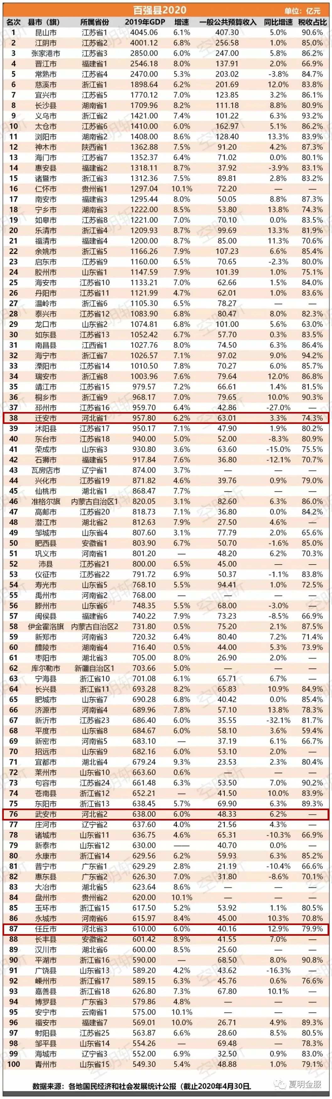 “2020中国县域经济100强”近期在北京联合发布。河北有三地上榜:迁安排名第38(河北第一),武安排名第76(河北第二),任丘排名第87(河北第三)。
