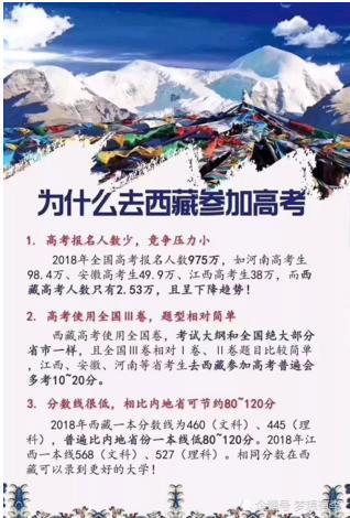 优势三、有西藏户口本、身份证,就可报名参加西藏高考。学生可不转学籍,不入读西藏高中。享受原户籍优势教育同时,又享受西藏低分数线的高考政策。