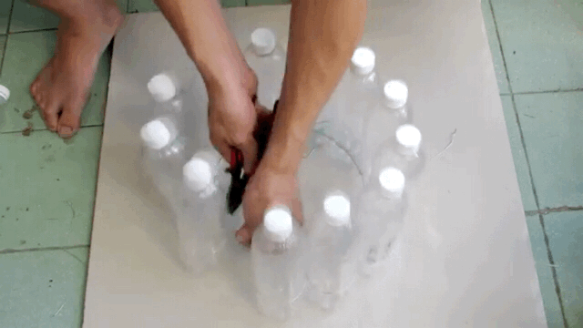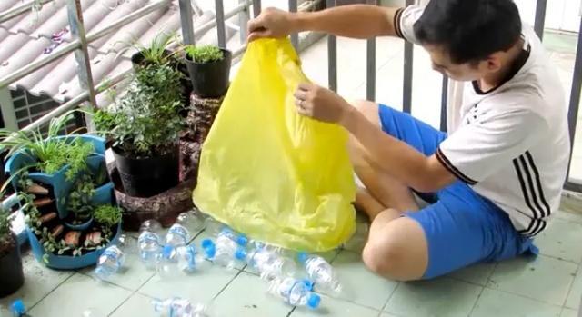 为了外表美观度达到他预期的效果,他对饮料瓶还经过了精挑细选,都是统一规划大小的透明式塑料瓶,并且都是带盖子的,为了方便后续的操作,瓶身上的花色贴牌外衣也一并拆掉了,规格色调统一,视觉效果才会更美观。