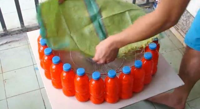 拆好的废旧电风扇网罩放进前面固定的大圈饮料瓶内,并将网罩固定在饮料瓶周边的铝丝圈线上,这样的目的是避免网罩在使用的过程中掉落。