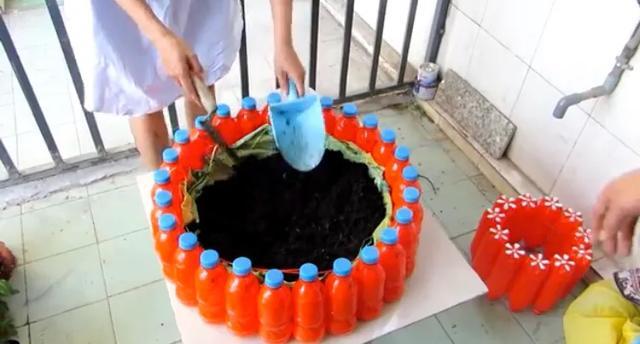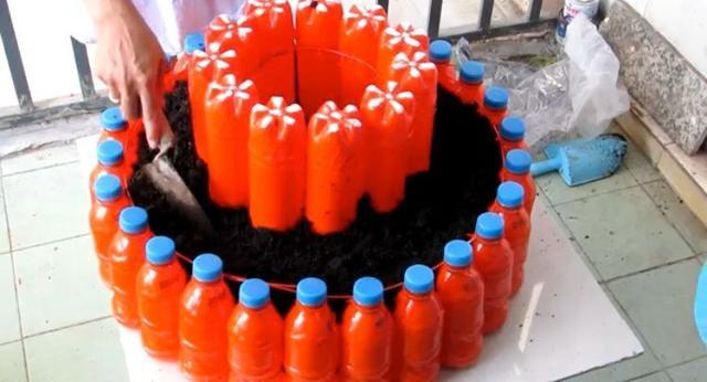 最后将小圈的饮料瓶子瓶盖方向朝下,插进泥土内,直到泥土遮挡掉瓶尖处,再朝里面加上栽种花草绿植需要的营养土壤,这样的上层的瓶子也就相当牢固了,一个美观实用的双层花盆就形成了。