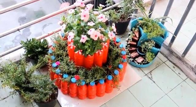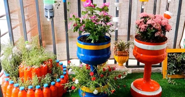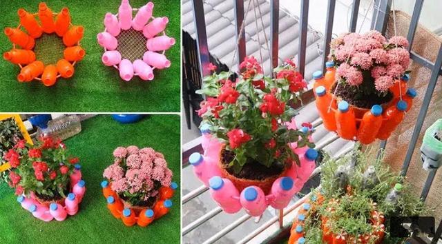 其实这位小哥不仅用电风扇网罩搭配饮料瓶做出了双层花盆,还有矿泉水大桶搭配木桩做出了多层大花盆。还有高脚杯式花盆,悬挂式花盆等多种造型,每一款都让我看得挪不开眼。