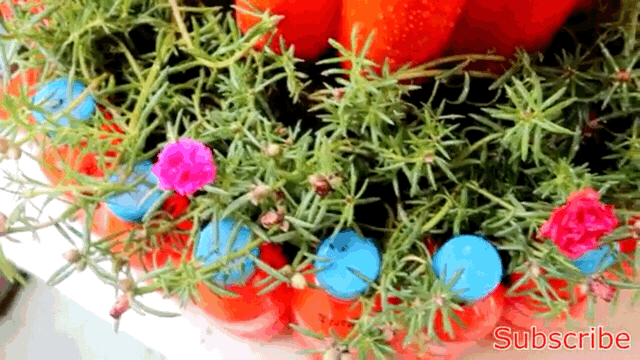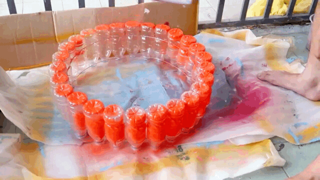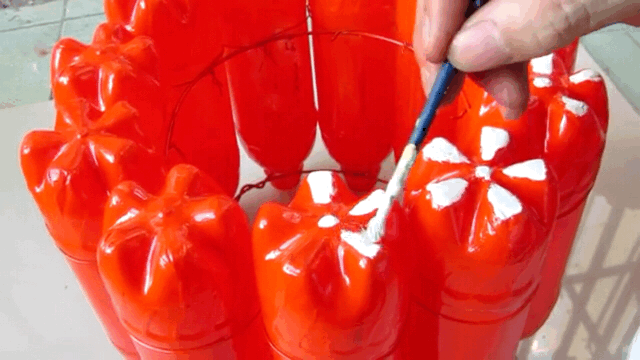 一般作为花盆使用都会有很多绿叶衬托,或许是为了花盆更突挑,也许是比较喜欢大红色,他将所有搭建好的饮料瓶子都喷上了红色的喷漆,整个喷漆过程也就几分钟。
