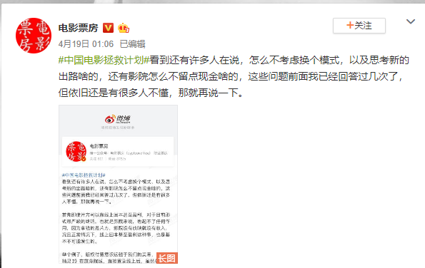 困境之下电影行业采取了不少自救措施,4月29日,国家电影局召开会议表示:要对电影院要给予特殊扶持政策,积极协调出租方减免租金,推动电影专项资金给予贷款贴息,支持各地购买发放电影票券。