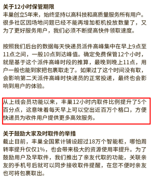 丰巢此后公布的数据也称,收费的确达到了让用户早取件的一定预期:12小时内取件率增加5%。