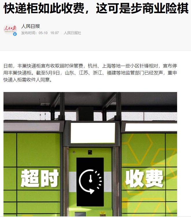 5月10日,上海一家媒体采访的快递员表示,丰巢两头吃饭(向快递员和业主都收费)的行为,是“过分追求收益”。