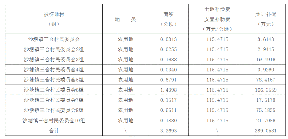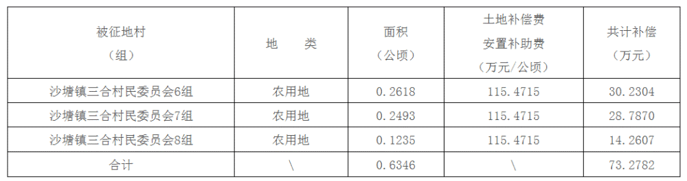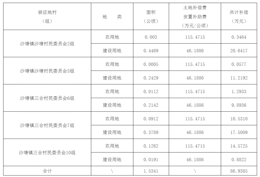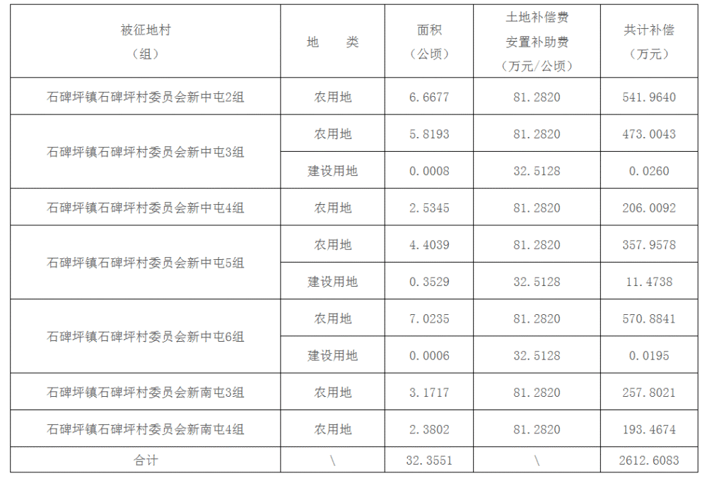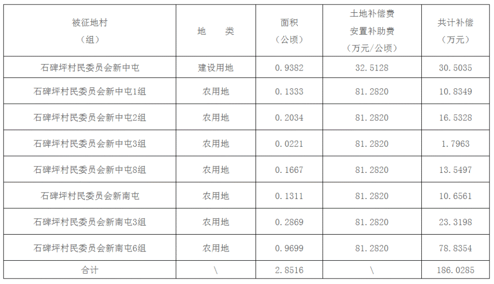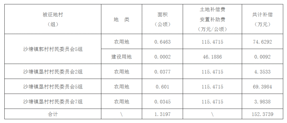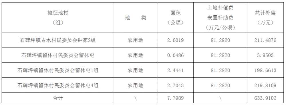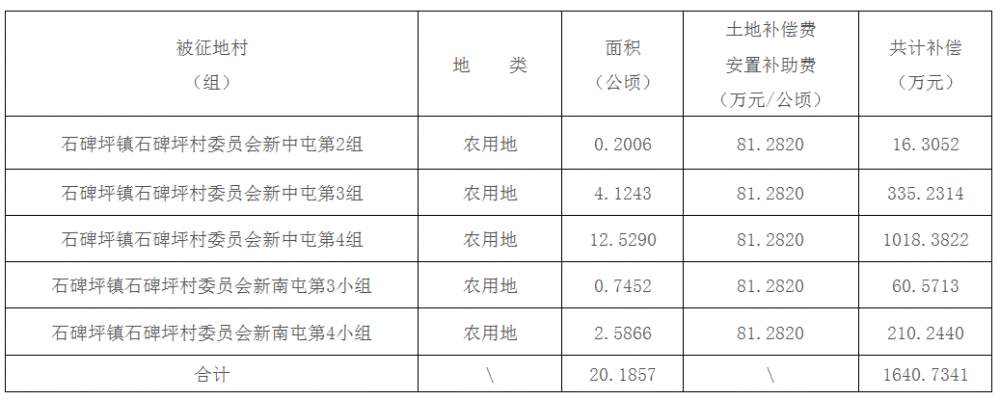 二、被征地村(组)、土地类型、面积及补偿费用标准