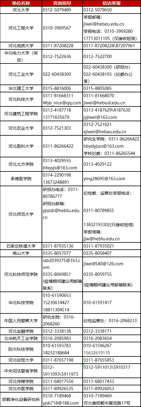 河北省2020年全国硕士研究生复试咨询、信访联系方式公布
