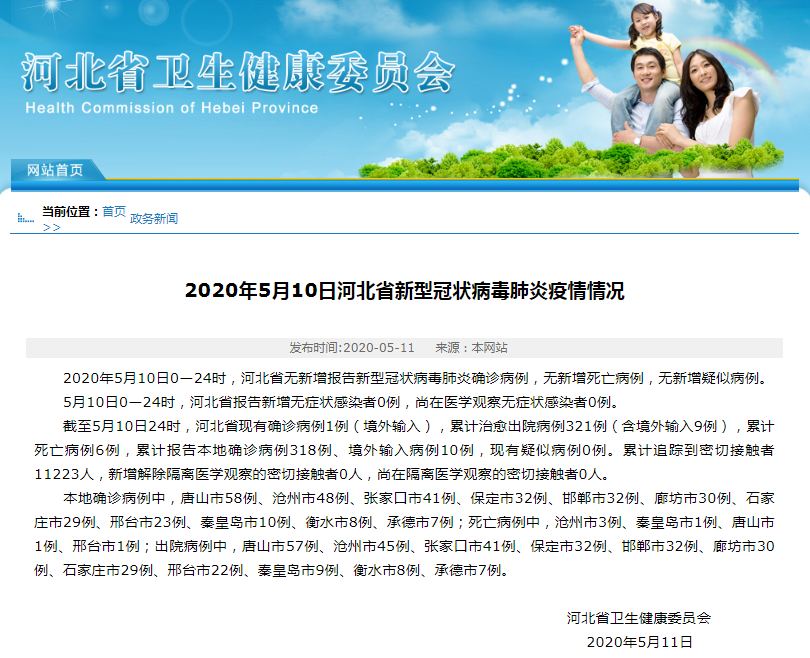 截至5月10日24时,河北省现有确诊病例1例(境外输入),累计治愈出院病例321例(含境外输入9例),累计死亡病例6例,累计报告本地确诊病例318例、境外输入病例10例,现有疑似病例0例。累计追踪到密切接触者11223人,新增解除隔离医学观察的密切接触者0人,尚在隔离医学观察的密切接触者0人。