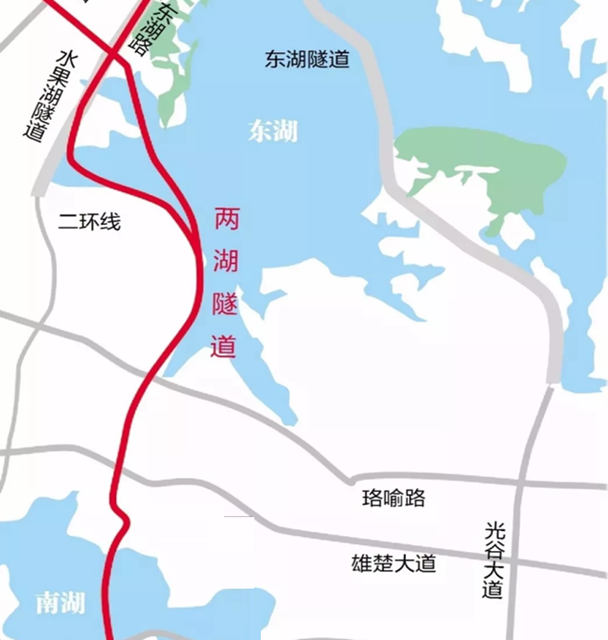 两湖隧道北段其中一股主线从二环线东湖路引出,东湖路与武汉大道、二环线青山段相连,武昌徐东、青山方向车辆可经此隧道快速抵达南湖、光谷地区;
