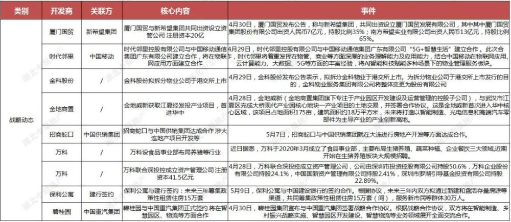 近期以万科、碧桂园、招商为代表的龙头房企战略动态频频,多以发展跨界转型为代表,其中碧桂园牵手重汽集团,加大在智慧园区、物流方面的建设合作,此外万科成立食品事业部布局养猪行业。