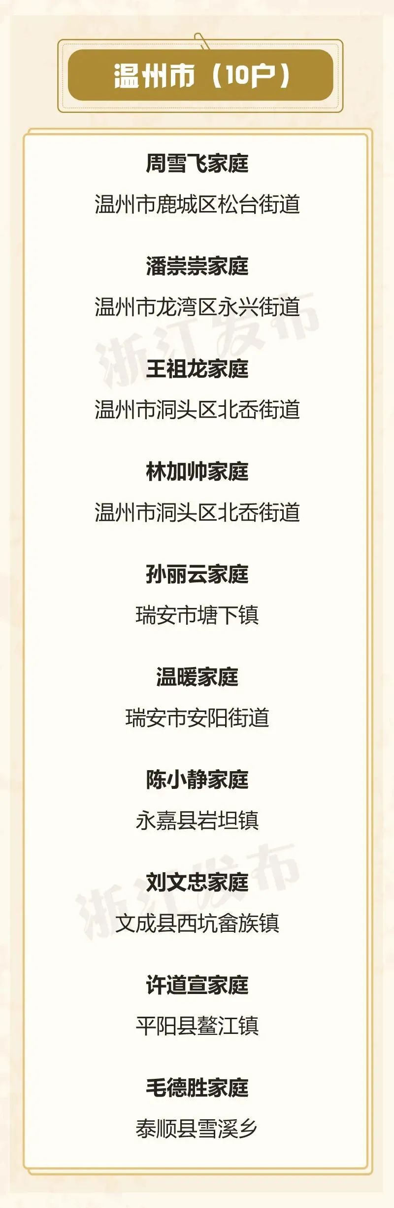 此外,根据今年4月9日发布的《温州市人民政府办公室关于印发温州市区户口迁入规定的通知》,获评省级以上“最美家庭”相关称号未超过2年的家庭成员,可在当地办理政策性落户,该规定将于今年6月1日起施行。这也是我市推出礼遇“最美家庭”机制以来,首次在制度层面实现礼遇新突破。