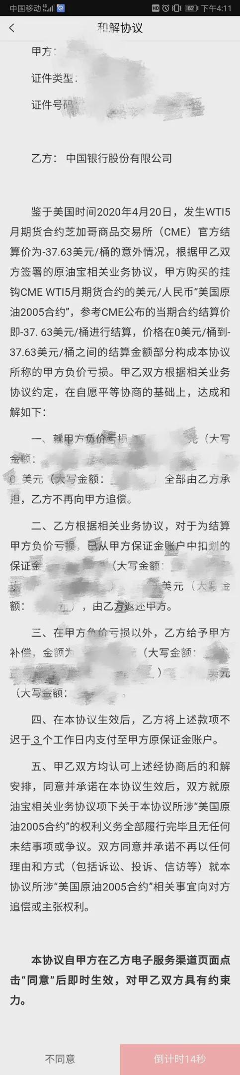 5月11日消息,中行APP推出原油宝线上和解协议。对比线上协议和纸质协议,二者在主要条款和补偿比例方面没有差异。相比纸质协议线上协议删除了保密条款、协调不成的争议条款等内容。线上协议还设置了倒计时。