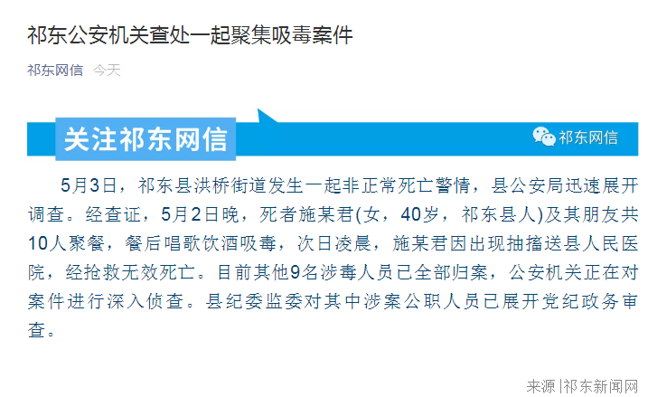 综合媒体5月11日报道,湖南省衡阳市祁东县文化馆一80后施姓女副馆长5月2日因酒后涉毒送医,3日因抢救无效死亡。目前其他9名涉毒人员已全部归案,公安机关正在对案件进行深入侦查。