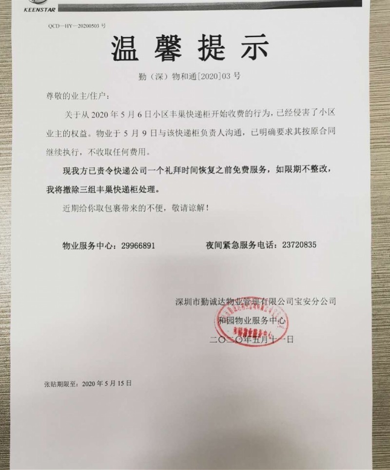 5月11日,南都记者来到位于宝安区的勤城达和园小区,发现该小区丰巢快递柜取件处张贴有公告。公告显示,由于丰巢快递柜近日开始收费的行为已经侵害了小区业主的权益,因此物业在5月9日与该快递柜负责人沟通,并责令快递公司一个礼拜时间恢复之前免费服务,如限期不整改,将撤除三组丰巢快递柜处理。