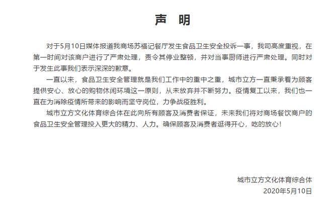 当晚,苏福记城市立方店所在的商场城市立方文化体育综合体通过官方微信号发布声明称,已责令其停业整顿,并对当事厨师进行严肃处理,同时对此事深表歉意。