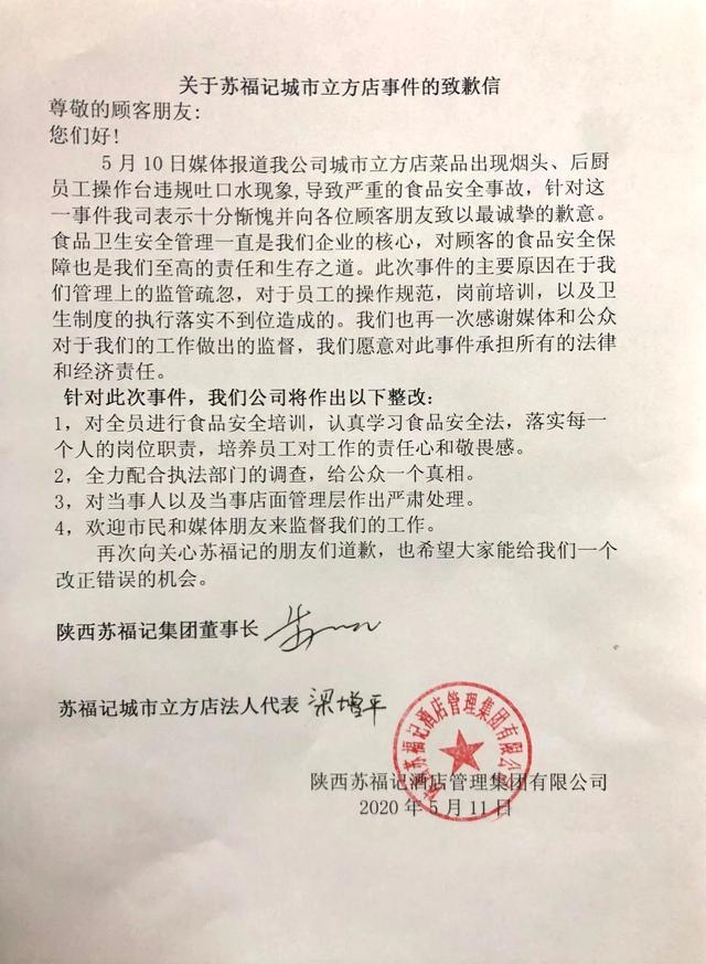 5月10日,西安市苏福记城市立方店被爆顾客要求厨师重新做菜,不料新上的菜里有烟头,厨师还向锅里吐口水。当晚,该餐厅所在的城市立方文化体育综合体发布声明,已责令其停业整顿,并对当事厨师进行严肃处理。11日,苏福记餐饮发布致歉信称,愿对此事承担所有的法律责任和经济责任,并将作出整改。