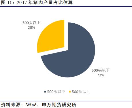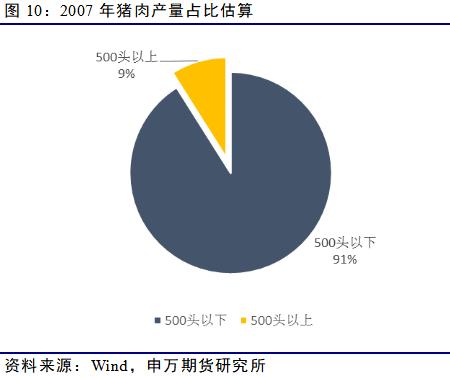 猪价周期的形成,很大程度上是由于此前国内生猪养殖结构是以散养户为主,散养户进入退出成本低、生产经营缺乏预测和规划,当他们识别到市场价格信号时容易集聚性生产或退成,使得市场上猪肉供给波动加大。我们粗略估算2007年时市场猪肉供给结构,发现当时500头以下的养殖户供给占比近90%。