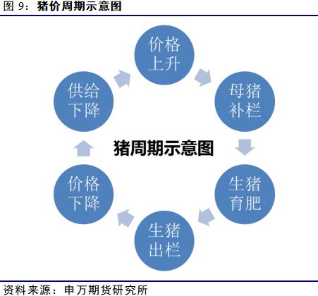 猪肉供给弹性一般大于需求弹性,猪肉价格周期类似“发散性蛛网模型”。在没有特别的外生性冲击的情况下,猪价周期一般为 “供给下降,价格上升,补栏,出栏、供给增加,价格下降,减少补栏、供给下降”。