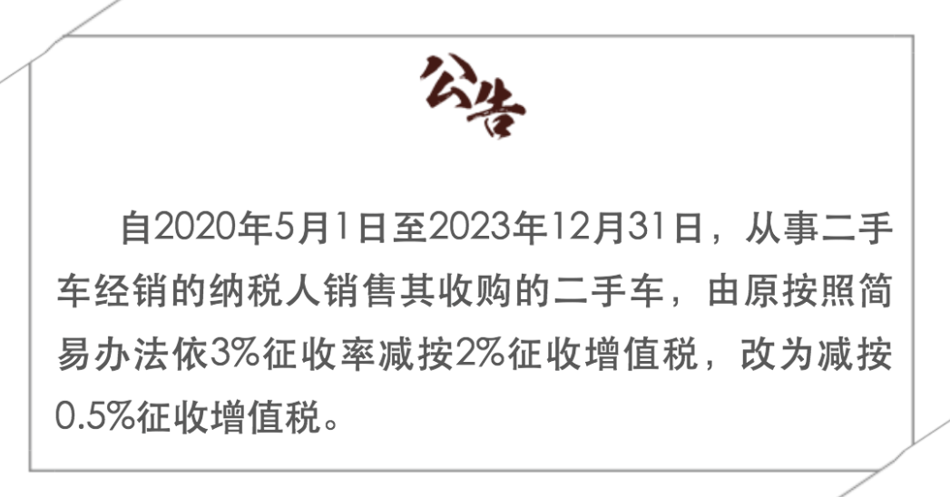 为提高新出台二手车经销业务减征增值税政策执行的确定性和统一性,公告明确,自2020年5月1日至2023年12月31日,从事二手车经销业务的纳税人销售其收购的二手车,减按0.5%征收率征收增值税,并按下列公式计算销售额:销售额=含税销售额/(1+0.5%) 同时,为规范征管,本公告发布后新出台的增值税征收率变动政策,均比照上述公式原理计算销售额。