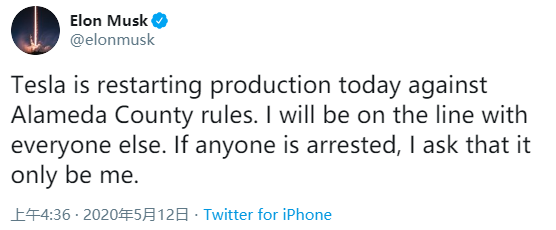 马斯克发推证确认了复工计划:“特斯拉今天违反阿拉米达县的规定重新开始生产。我将会与所有员工站在一起面对风险。如果有人被捕,我要求只逮捕我一个人。”