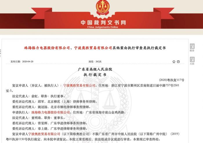 而最新发布的广东省高级人民法院执行裁定书(2020)粤执复117号显示,上述申请被驳回。目前,法院已将赔偿款划拨到格力电器账户。