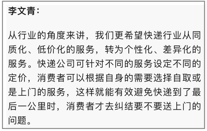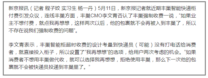 CMO说的个性化和差异化的具象业务模式应该是送到家贵一点,送丰巢便宜一点。这是将权利自己享用,把义务甩给快递公司,这个思路大写的服气。我们昨天(指5月10日)申明的第二点诉求“在快递柜上张贴醒目提示,请快递员必须先行联系客户同意下方可投入丰巢柜”,我们只是要求丰巢柜机上有提示标识的义务,但是并不等于苛求做到快递员100%进行电话拨打,用户可以通过在快递面单上备注“不投丰巢柜”来减轻快递员的工作量。