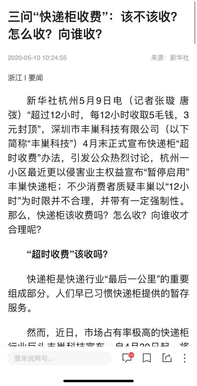 前天,上海中环花苑小区 “致丰巢公司的一封公开信”,引发各方转发。公开信逻辑缜密、有理有据,反驳丰巢“你们不是弱者,单柜利润超2倍”。该文发布后迅速获得“10w+”,被网友们戏称为是“给丰巢公关上了一课”。对此,丰巢科技CMO(首席营销官)李文青随后在接受媒体采访时表示:丰巢财务数据都有相关的公告信息,因此对于公告中的质疑不作回应;同时表示后续或将不会有相关声明发出。对于收费质疑,李文青表示,不存在强制收费,两次点击“我再想想”后(快递)不再被投入。