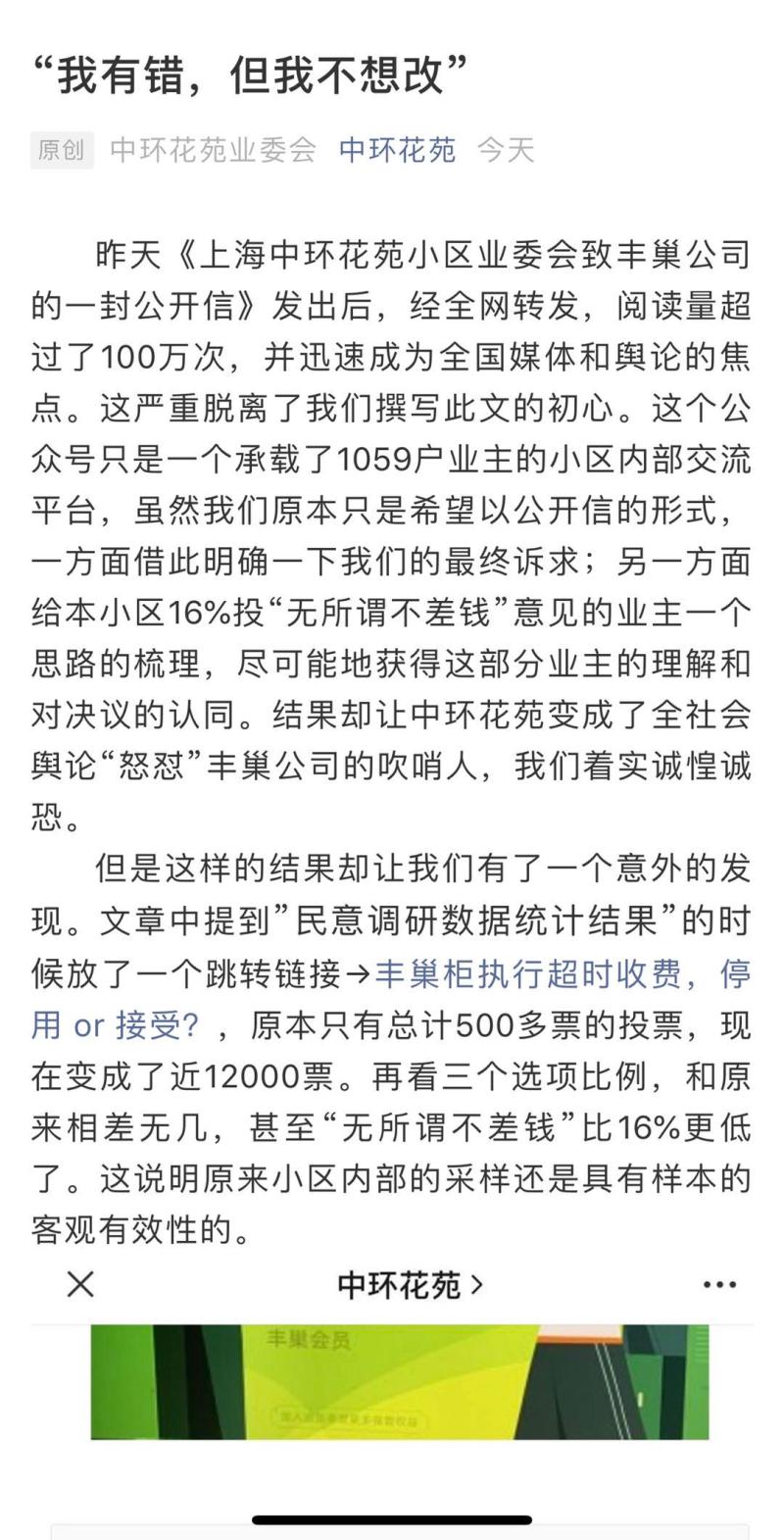 昨天(5月10日)《上海中环花苑小区业委会致丰巢公司的一封公开信》发出后,经全网转发,阅读量超过了100万次,并迅速成为全国媒体和舆论的焦点。这严重脱离了我们撰写此文的初心。这个公众号只是一个承载了1059户业主的小区内部交流平台,虽然我们原本只是希望以公开信的形式,一方面借此明确一下我们的最终诉求;另一方面给本小区16%投“无所谓不差钱”意见的业主一个思路的梳理,尽可能地获得这部分业主的理解和对决议的认同。结果却让中环花苑变成了全社会舆论“怒怼”丰巢公司的吹哨人,我们着实诚惶诚恐。