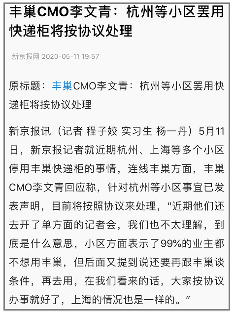 上海的小区方面应该没有"99%的业主不想用丰巢的表述"。丰巢公司CMO对“不想用丰巢的人”理解上存在误区。“不想用丰巢的人”还要分成:1,现在不想用但是若调整到24小时收费就会用的人;2,希望免费使用的人;3,不接受快递柜服务的人。我想我们所提出的诉求是属于第一类群体。为了实现这个目标,所以我们提倡沟通、沟通和沟通,拒绝网络暴力,不到万不得已也不希望拆除丰巢快递柜,从而造成社会资源的浪费。其实,24小时开始计费丰巢不亏,能开始对用户端收费,已经是迈出了0到1质的飞跃了。