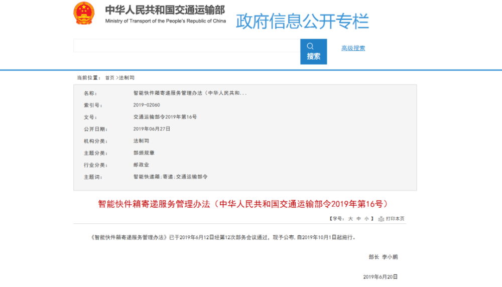 交通运输部发布的《智能快件箱寄递服务管理办法》于2019年6月12日经第12次部务会议通过,自2019年10月1日起施行。