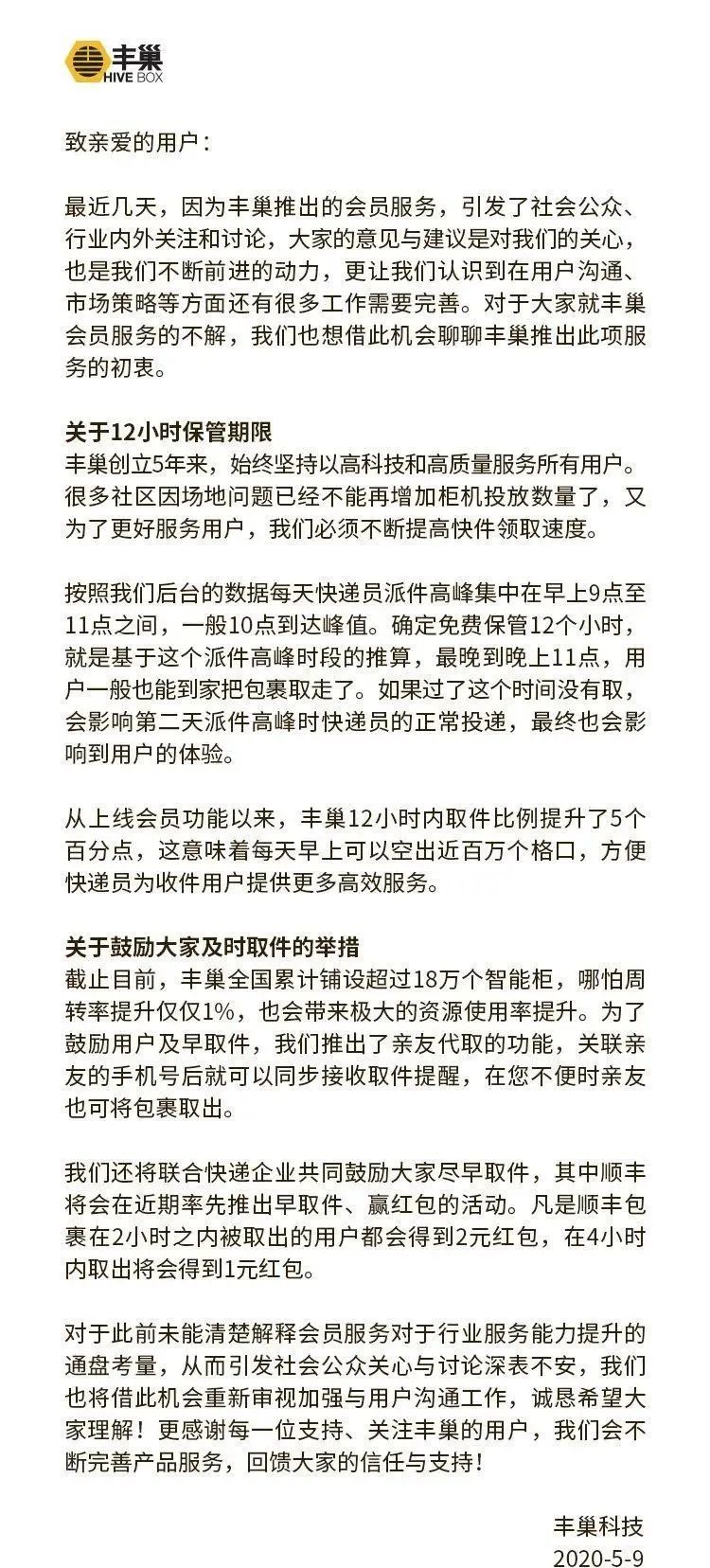 按照丰巢的收费规则,普通用户可免费保管包裹12小时,超时后,每12小时将收取0.5元,超过时长不足12小时按12小时计算,每单3元封顶。如果购买丰巢会员,可享受优惠。其中,会员月卡5元/月,季卡12元/3个月,在对应期限内可不限保管次数,每件可享7天长时存放。