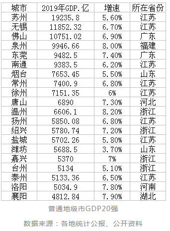 2019年普通地级市GDP20强分别是:苏州、无锡、佛山、泉州、东莞、南通、烟台、常州、徐州、唐山、温州、扬州、绍兴、盐城、潍坊、嘉兴、台州、泰州、洛阳和襄阳。其中排名前19位的城市均超过了5000亿元大关,更有3个城市进入到GDP万亿俱乐部行列。