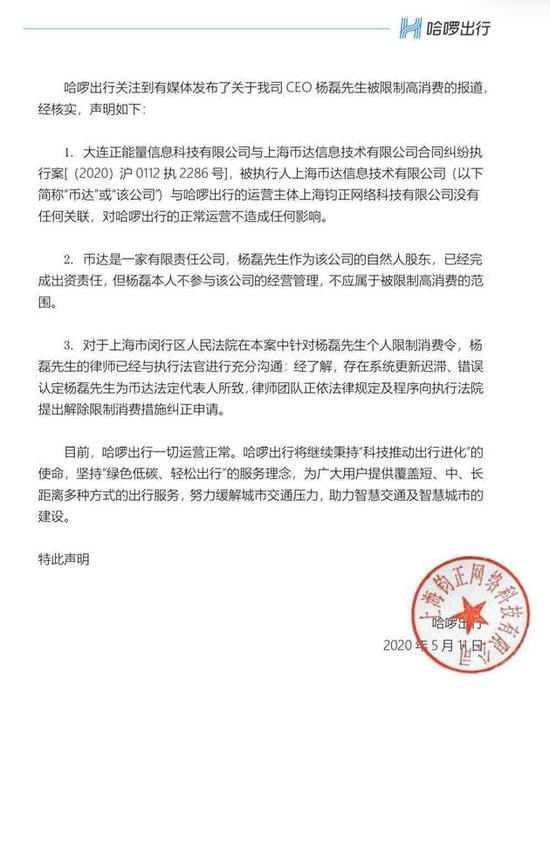 哈啰出行在声明中表示,大连正能量信息科技有限公司与上海币达信息技术有限公司合同纠纷执行案[(2020)沪0112执2286号],被执行人上海币达信息技术有限公司(以下简称“币达”)与哈啰出行的运营主体上海钧正网络科技有限公司没有任何关联,对哈啰出行的正常运营不造成任何影响。目前,哈啰出行一切运营正常。